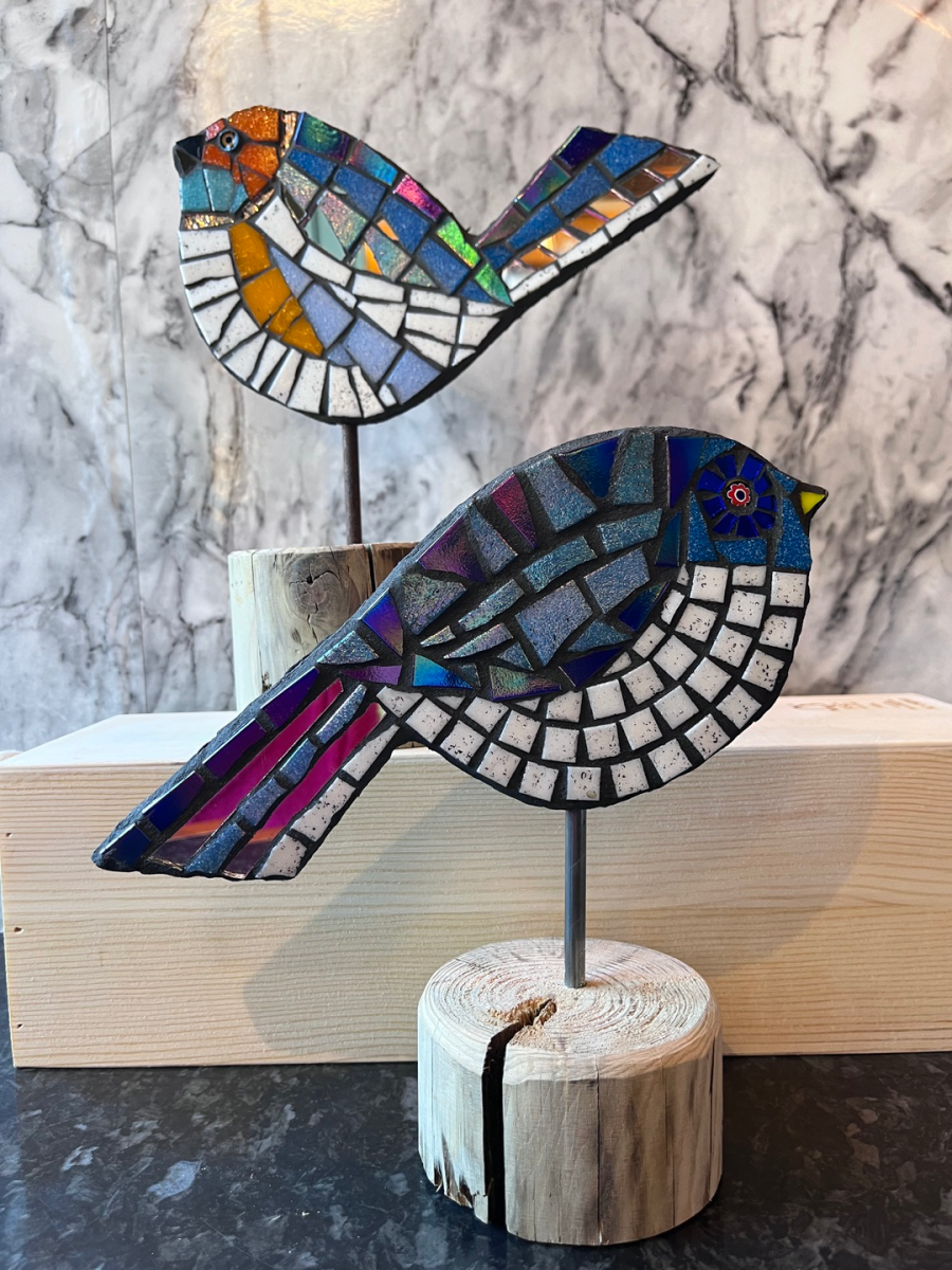 You will design & create a colourful mosaic bird perched proudly on a wooden plinth. The bird is approx 13/19cms plus plinth 20+cms.